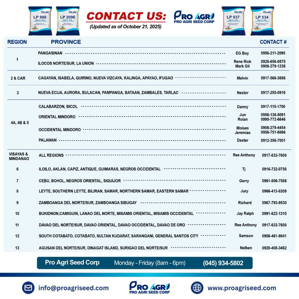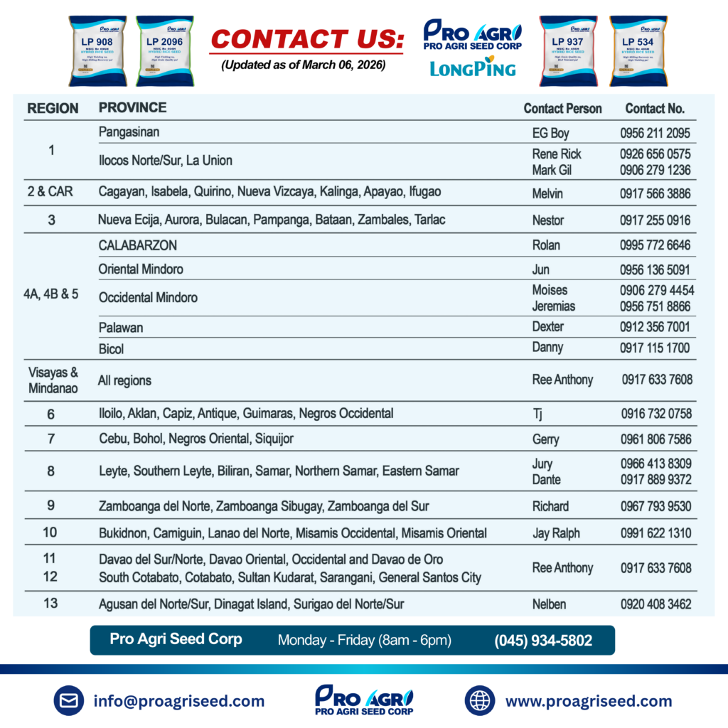 Pro Agri Seed Corp. is the exclusive seed producer and distributor of LP hybrid rice seed varieties in the Philippines. Unauthorized selling, production, and counterfeiting of LP hybrid rice seed varieties constitute violations of Republic Act No. 7394 (Consumer Act of the Philippines) and Republic Act No. 8293 (Intellectual Property Code of the Philippines), and are punishable by law.